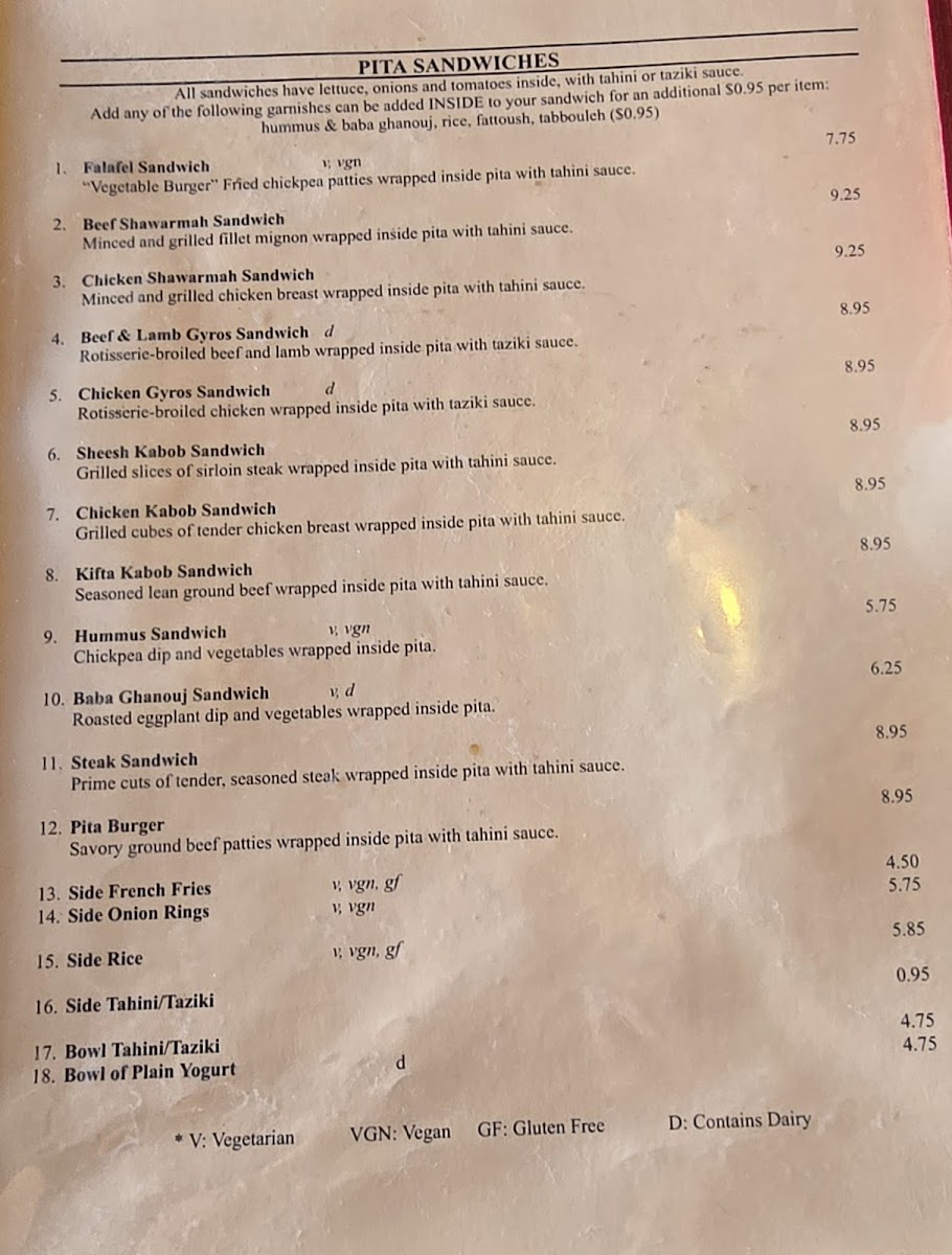 At Jerusalem Restaurant, the menu is a tantalizing array of Middle Eastern delights. Start your culinary journey with their Pita Sandwiches, where options such as the Chicken Kabob Sandwich ($8.95) feature grilled cubes of fork-tender chicken breast nestled in warm pita, complemented by crunchy lettuce, ripe tomatoes, and tangy tahini or tzatziki sauce. Vegetarian diners will relish the Hummus Sandwich ($6.25), filled with creamy chickpea goodness, fresh veggies, and a drizzle of zesty sauce.