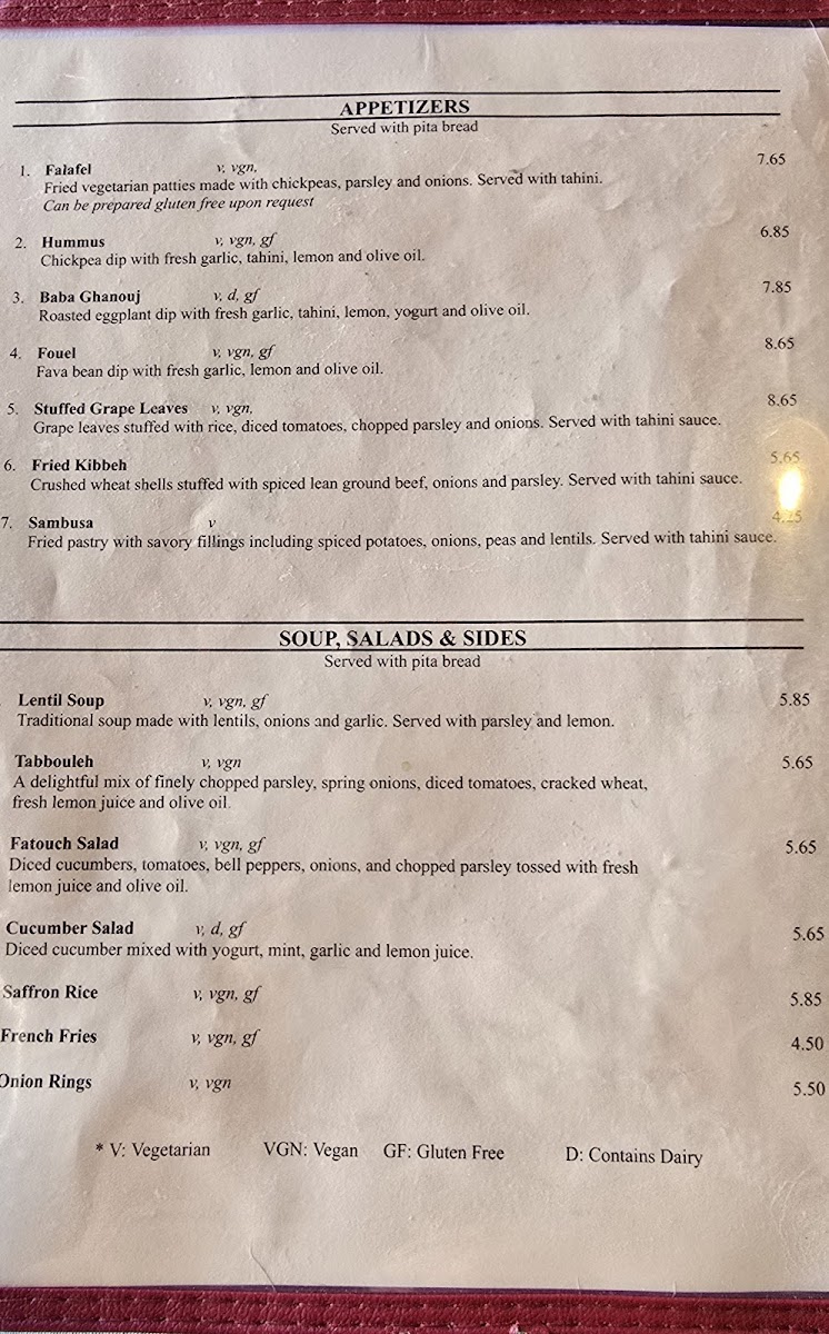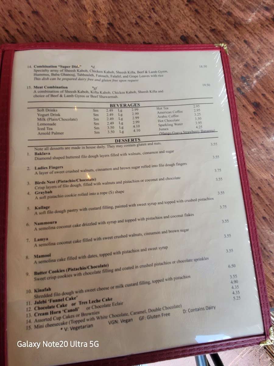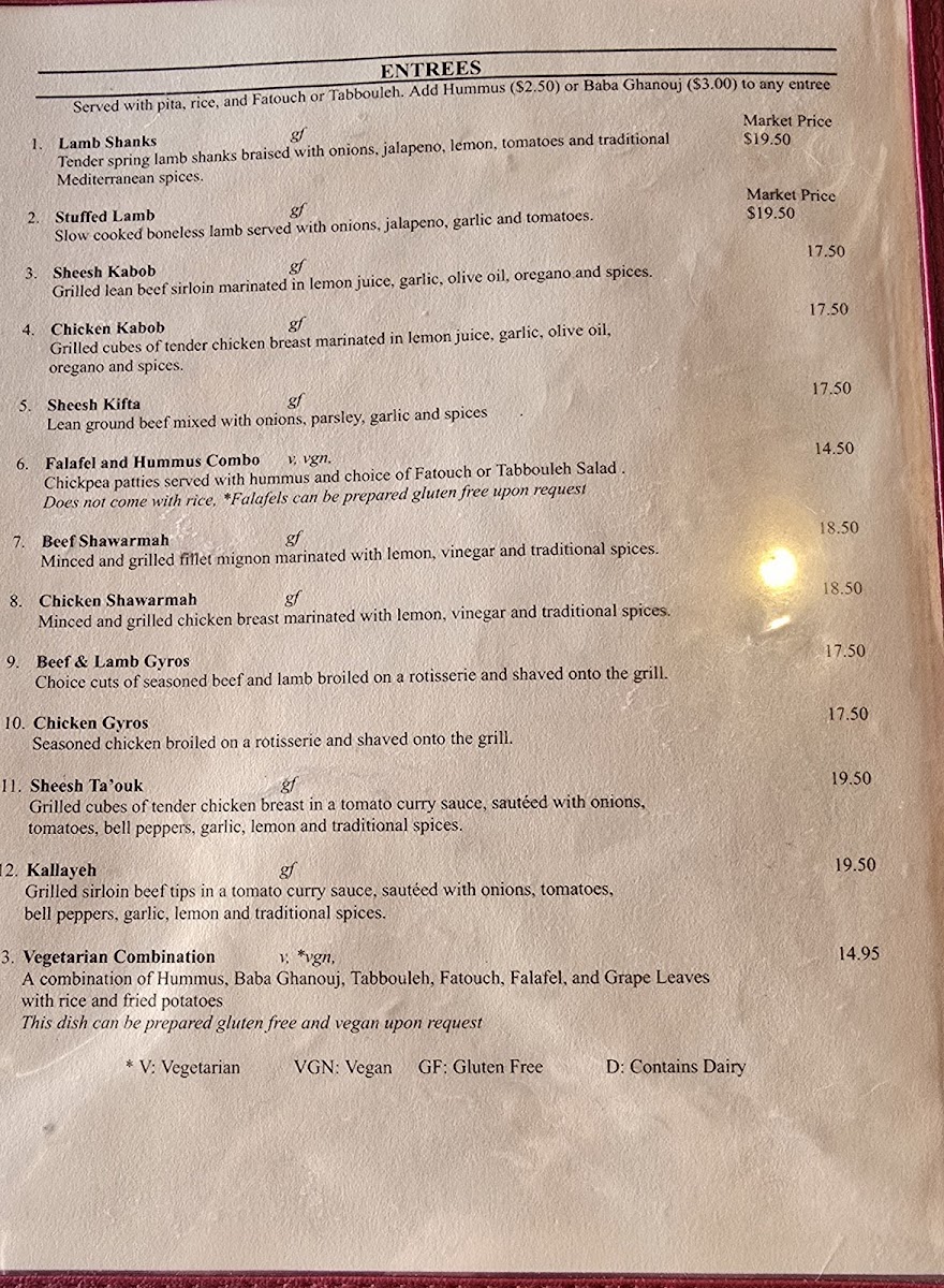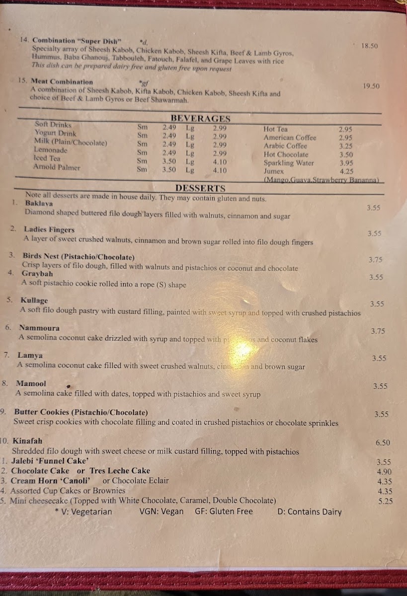 For the heartier appetite, don’t miss the Sheesh Ta'ouk Entree ($19.50)—grilled chicken marinated and sautéed with a medley of vibrant spices, served atop fluffy curry rice alongside fresh Fatouch or Tabbouleh salad. Indulge in the Lamb Shanks for a truly memorable dining experience; tender meat braised to perfection, bursting with flavors that speak of family recipes passed down through generations. Each dish is not just a meal, but a celebration of Middle Eastern culture and hospitality.